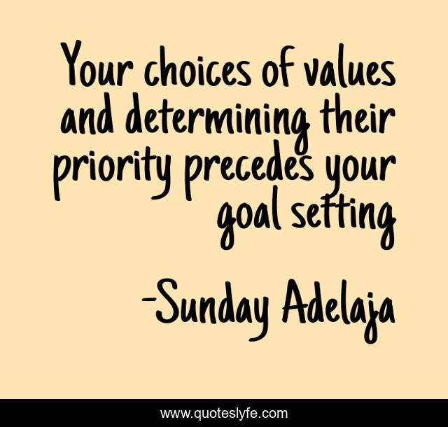 This page presents the quote "Your choices of values and determining their priority precedes your goal setting". Author of this quote is Sunday Adelaja. This quote is about life, goal, priorities, choice, determination, value, truth, calling, purpose,.