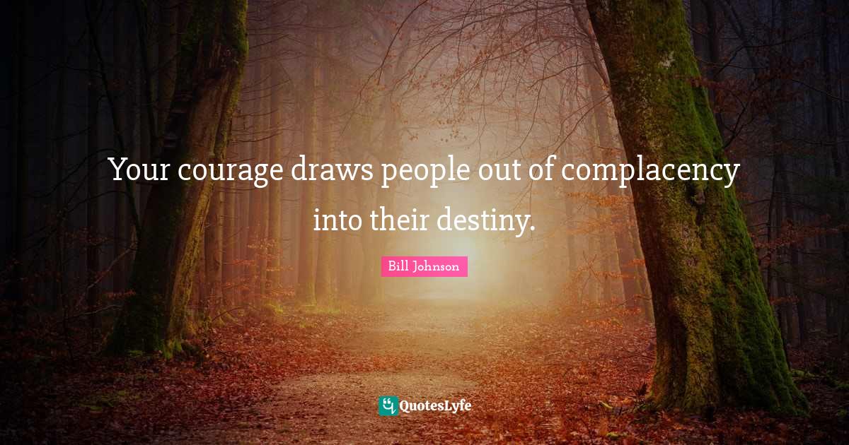 This page presents the quote "Your courage draws people out of complacency into their destiny.". Author of this quote is Bill Johnson. This quote is about courage, people, destiny, complacency, draws,.