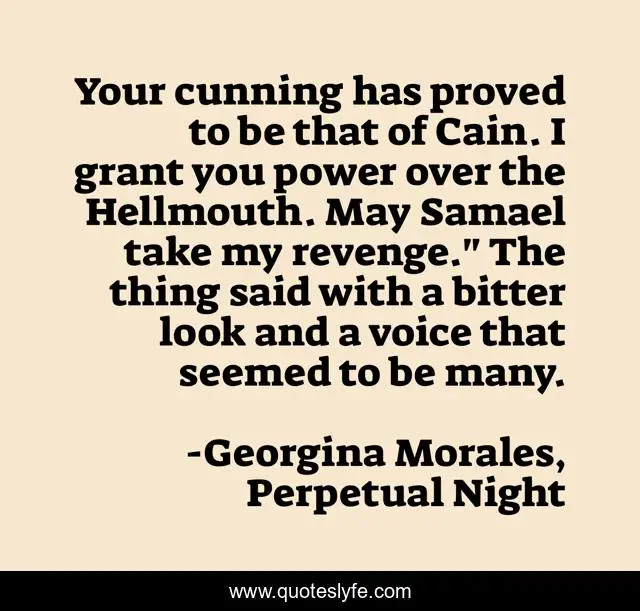 This page presents the quote "Your cunning has proved to be that of Cain. I grant you power over the Hellmouth. May Samael take my revenge." The thing said with a bitter look and a voice that seemed to be many.". Author of this quote is Georgina Morales, Perpetual Night. This quote is about hellmouth, witchcraft, horror, revenge, demons, cain,.