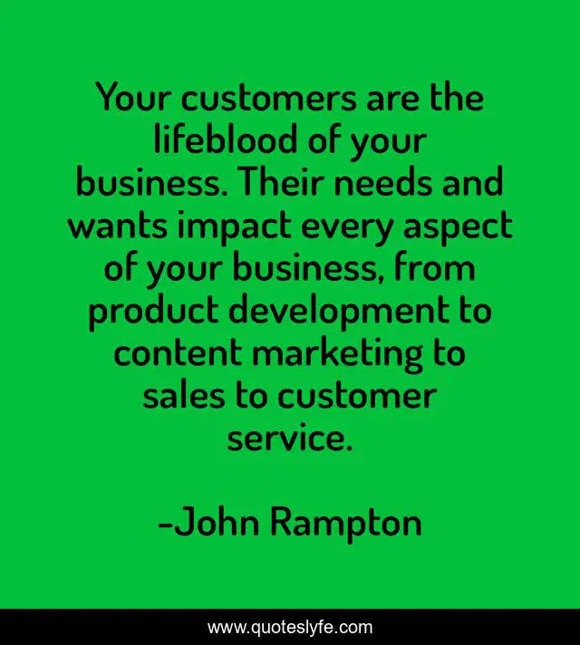 This page presents the quote "Your customers are the lifeblood of your business. Their needs and wants impact every aspect of your business, from product development to content marketing to sales to customer service.". Author of this quote is John Rampton. This quote is about impact, marketing, service,.