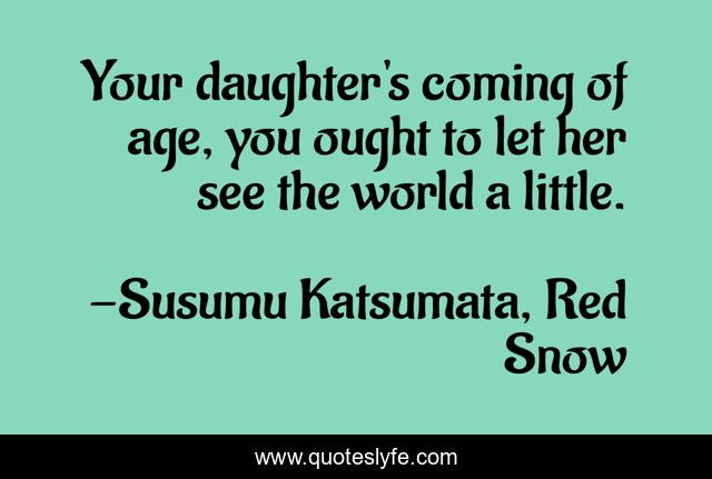 This page presents the quote "Your daughter's coming of age, you ought to let her see the world a little.". Author of this quote is Susumu Katsumata, Red Snow. This quote is about daughter, family, susumu-katsumata, father, echo, imagination, red-snow, see-the-world, mother,.