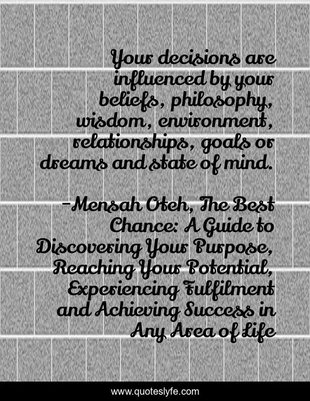 "Mensah Oteh, The Best Chance: A Guide to Discovering Your Purpose, Reaching Your Potential, Experiencing Fulfilment and Achieving Success in Any Area of Life Quotes." Quoteslyfe.com, 2025. Sat. 06 Dec. 2025. <https://www.quoteslyfe.com/quote/Your-decisions-are-influenced-by-your-beliefs-49000>.