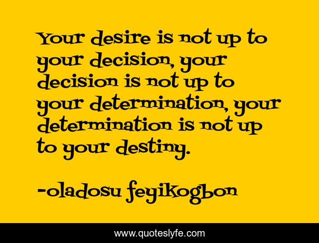 This page presents the quote "Your desire is not up to your decision, your decision is not up to your determination, your determination is not up to your destiny.". Author of this quote is oladosu feyikogbon. This quote is about perfect, life, move-on, feyikogbon, advice, past, future, quote-i-love, tutoria,.