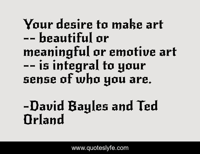 This page presents the quote "Your desire to make art -- beautiful or meaningful or emotive art -- is integral to your sense of who you are.". Author of this quote is David Bayles and Ted Orland. This quote is about art, creativity, self-expression,.