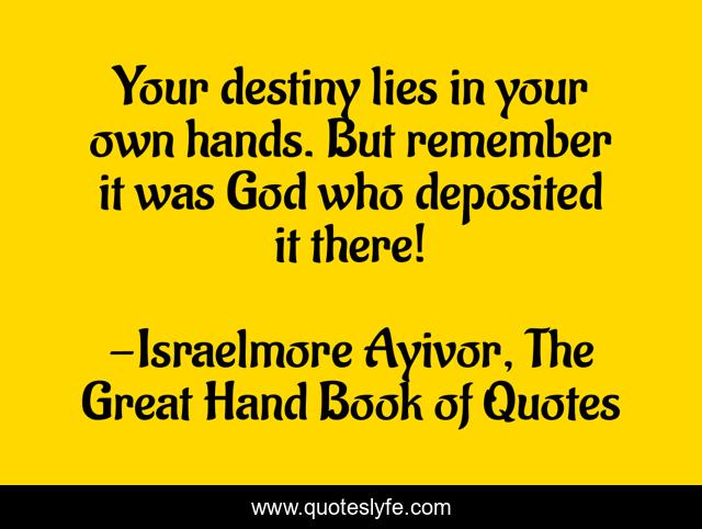 This page presents the quote "Your destiny lies in your own hands. But remember it was God who deposited it there!". Author of this quote is Israelmore Ayivor, The Great Hand Book of Quotes. This quote is about food-for-thought, destiny, creator, your-destiny, god, life, jehovah, hand, obey-god,.