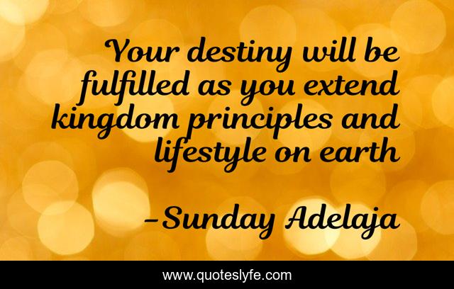 This page presents the quote "Your destiny will be fulfilled as you extend kingdom principles and lifestyle on earth". Author of this quote is Sunday Adelaja. This quote is about fulfilled, earth, destiny, extend,.
