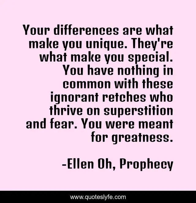 This page presents the quote "Your differences are what make you unique. They're what make you special. You have nothing in common with these ignorant retches who thrive on superstition and fear. You were meant for greatness.". Author of this quote is Ellen Oh, Prophecy. This quote is about enthusiasm, inspirational,.