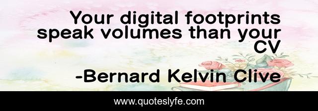 This page presents the quote "Your digital footprints speak volumes than your CV". Author of this quote is Bernard Kelvin Clive. This quote is about online-reputation-management, social-media, digital-footprint, digital-etiquette, personal-branding, personal-brand, reputation-management, cv,.