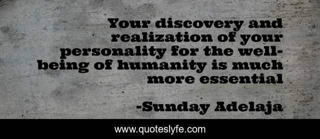 This page presents the quote "Your discovery and realization of your personality for the well-being of humanity is much more essential". Author of this quote is Sunday Adelaja. This quote is about self-discovery, humanity, calling, purpose, realization, essential, personality,.