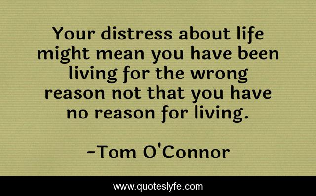 This page presents the quote "Your distress about life might mean you have been living for the wrong reason not that you have no reason for living.". Author of this quote is Tom O'Connor. .