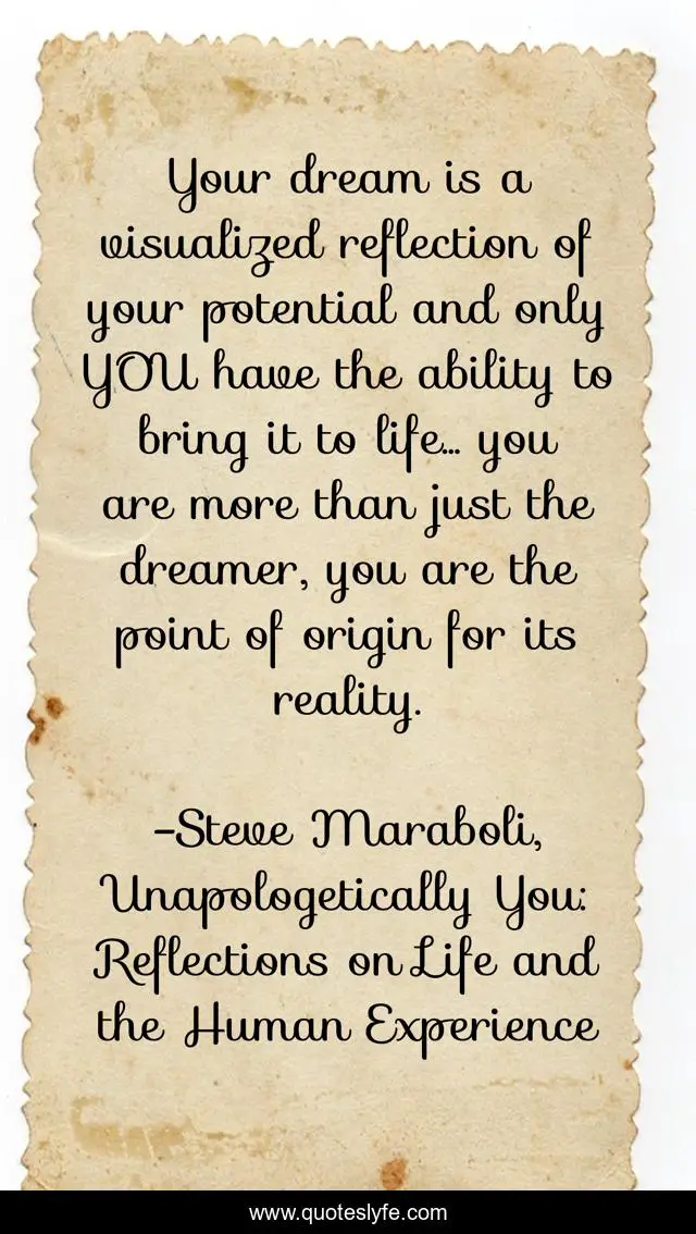 This page presents the quote "Your dream is a visualized reflection of your potential and only YOU have the ability to bring it to life... you are more than just the dreamer, you are the point of origin for its reality.". Author of this quote is Steve Maraboli, Unapologetically You: Reflections on Life and the Human Experience. This quote is about quote, potential, dreams, goals, success,.