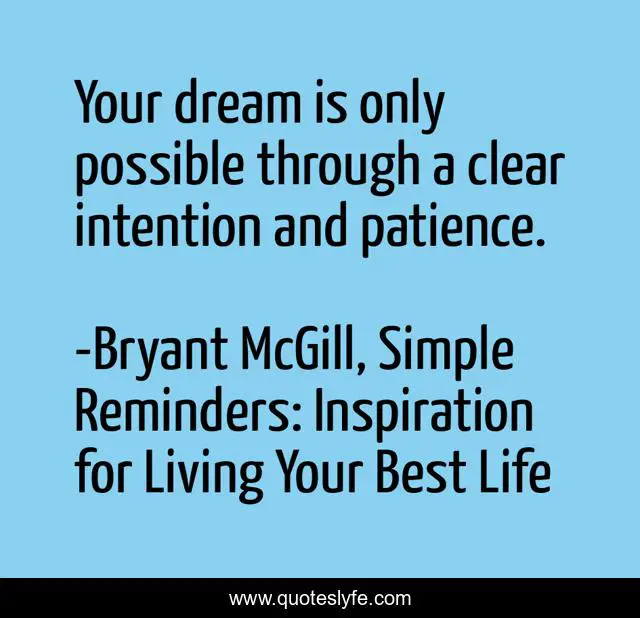 This page presents the quote "Your dream is only possible through a clear intention and patience.". Author of this quote is Bryant McGill, Simple Reminders: Inspiration for Living Your Best Life. This quote is about intention, dreams, patience,.