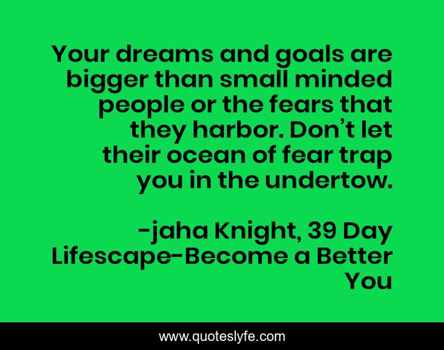 This page presents the quote "Your dreams and goals are bigger than small minded people or the fears that they harbor. Don’t let their ocean of fear trap you in the undertow.". Author of this quote is jaha Knight, 39 Day Lifescape-Become a Better You. This quote is about fear-of-the-future, fear-of-living, fearless, fear-of-failure, bullying, fear-of-unknown, dreaming, dreams-coming-true, dream,.