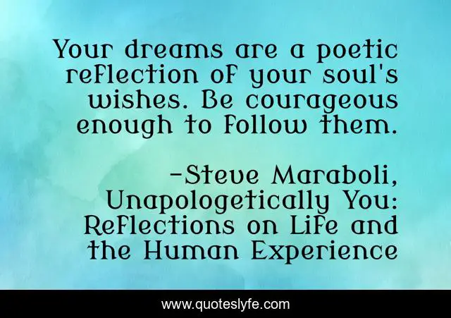 This page presents the quote "Your dreams are a poetic reflection of your soul's wishes. Be courageous enough to follow them.". Author of this quote is Steve Maraboli, Unapologetically You: Reflections on Life and the Human Experience. This quote is about life, courage, dreams, goals, success,.