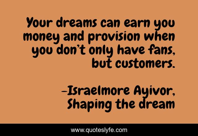 This page presents the quote "Your dreams can earn you money and provision when you don’t only have fans, but customers.". Author of this quote is Israelmore Ayivor, Shaping the dream. This quote is about customer, sell, food-for-thought, buy, money, business, personal-branding, brand, clients,.