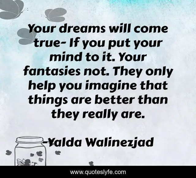 This page presents the quote "Your dreams will come true- If you put your mind to it. Your fantasies not. They only help you imagine that things are better than they really are.". Author of this quote is Yalda Walinezjad. .