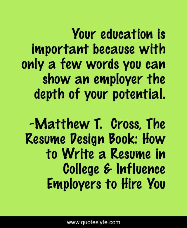 This page presents the quote "Your education is important because with only a few words you can show an employer the depth of your potential.". Author of this quote is Matthew T. Cross, The Resume Design Book: How to Write a Resume in College & Influence Employers to Hire You. This quote is about development, perseverance, hard-work, career-advice, resume, career, resume-advice, career-development, career-change,.