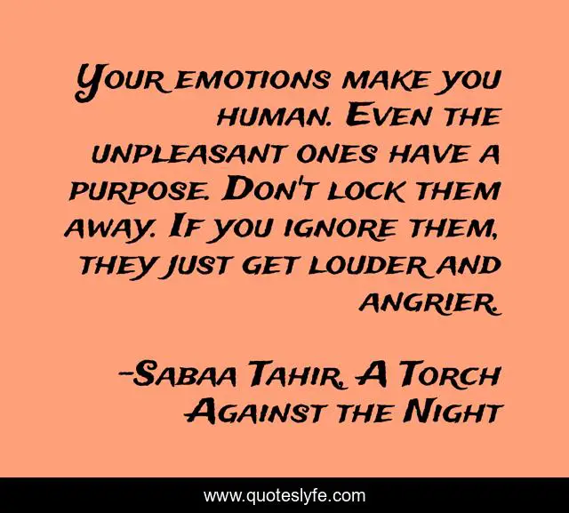 This page presents the quote "Your emotions make you human. Even the unpleasant ones have a purpose. Don't lock them away. If you ignore them, they just get louder and angrier.". Author of this quote is Sabaa Tahir, A Torch Against the Night. This quote is about emotions, human, purpose,.