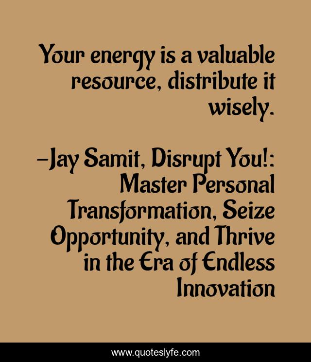 "Jay Samit, Disrupt You!: Master Personal Transformation, Seize Opportunity, and Thrive in the Era of Endless Innovation Quotes." Quoteslyfe.com, 2026. Mon. 12 Jan. 2026. <https://www.quoteslyfe.com/quote/Your-energy-is-a-valuable-resource-distribute-106495>.