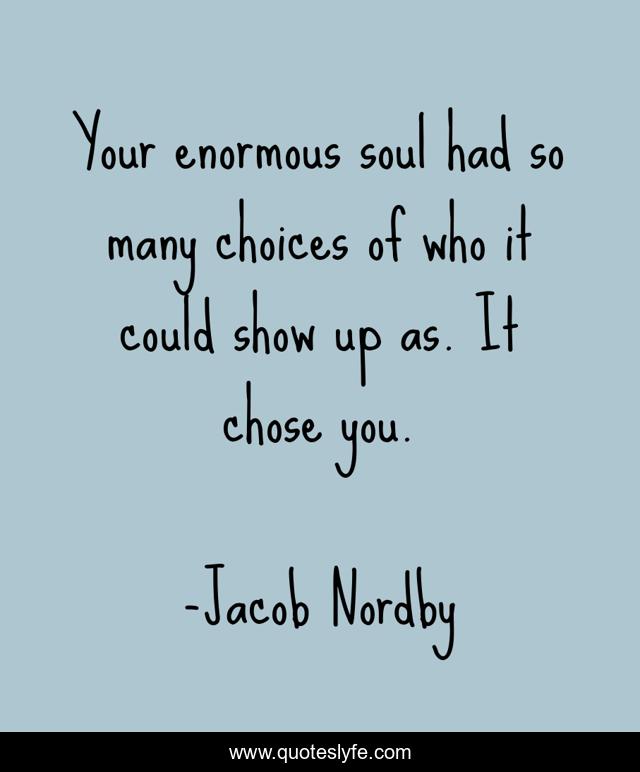 "Jacob Nordby Quotes." Quoteslyfe.com, 2025. Mon. 08 Dec. 2025. <https://www.quoteslyfe.com/quote/Your-enormous-soul-had-so-many-choices-255185>.