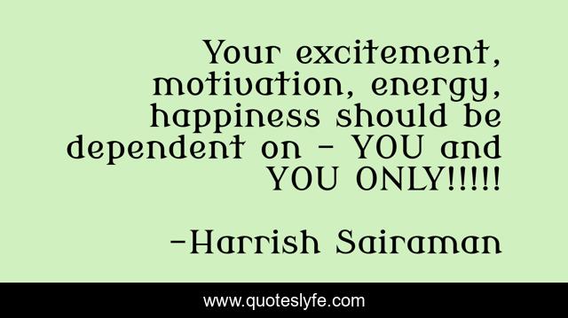 This page presents the quote "Your excitement, motivation, energy, happiness should be dependent on – YOU and YOU ONLY!!!!!". Author of this quote is Harrish Sairaman. This quote is about dependent, excitement, motivation, energy, happiness,.