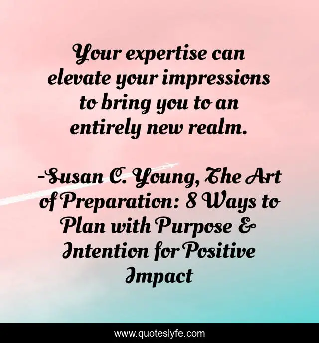 "Susan C. Young, The Art of Preparation: 8 Ways to Plan with Purpose & Intention for Positive Impact Quotes." Quoteslyfe.com, 2025. Tue. 09 Dec. 2025. <https://www.quoteslyfe.com/quote/Your-expertise-can-elevate-your-impressions-to-227434>.