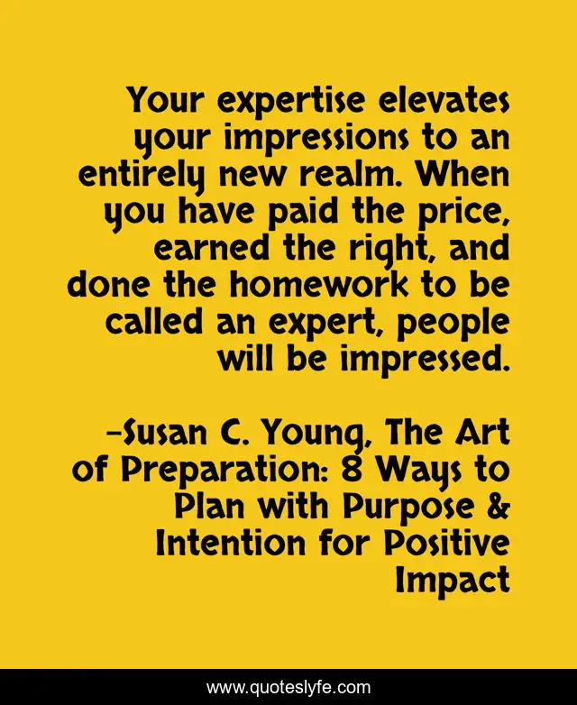 "Susan C. Young, The Art of Preparation: 8 Ways to Plan with Purpose & Intention for Positive Impact Quotes." Quoteslyfe.com, 2025. Sat. 06 Dec. 2025. <https://www.quoteslyfe.com/quote/Your-expertise-elevates-your-impressions-to-an-227458>.