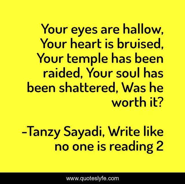 This page presents the quote "Your eyes are hallow, Your heart is bruised, Your temple has been raided, Your soul has been shattered, Was he worth it?". Author of this quote is Tanzy Sayadi, Write like no one is reading 2. This quote is about heart, eyes, shattered, soul, temple, bruised, hallow,.