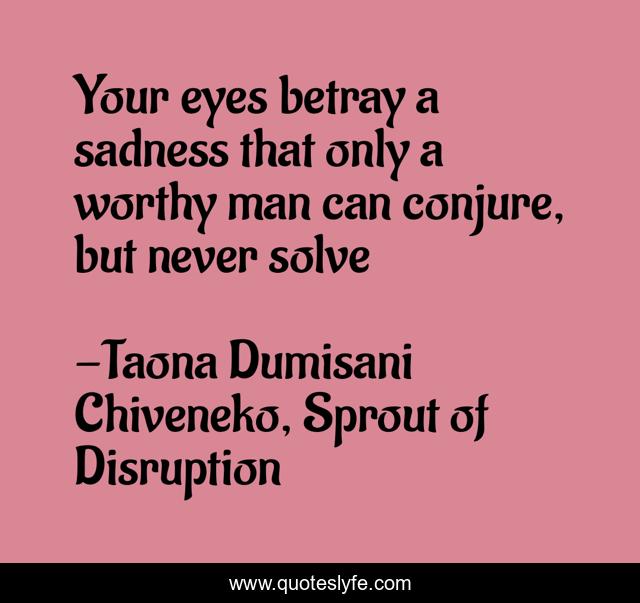 This page presents the quote "Your eyes betray a sadness that only a worthy man can conjure, but never solve". Author of this quote is Taona Dumisani Chiveneko, Sprout of Disruption. This quote is about africa, paranormal, zimbabwe, suspense, mystrey, thriller,.