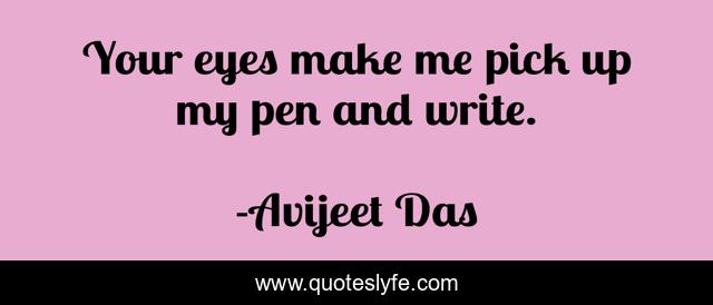 This page presents the quote "Your eyes make me pick up my pen and write.". Author of this quote is Avijeet Das. This quote is about eyes, muses, eyes-the-true-expression, eyes-like-stars, pen, writers, quotes-on-muses, writers-on-writing, quotes-on-eyes,.