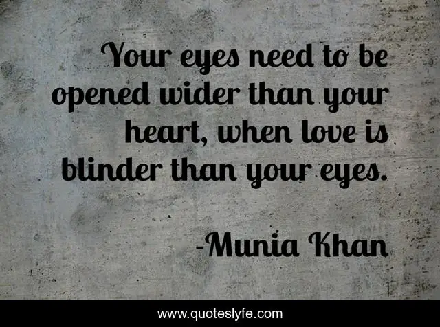 This page presents the quote "Your eyes need to be opened wider than your heart, when love is blinder than your eyes.". Author of this quote is Munia Khan. This quote is about blind, heart, eyes, hearts, eye, blinded-by-love, wide, wisdom, love-hurts,.