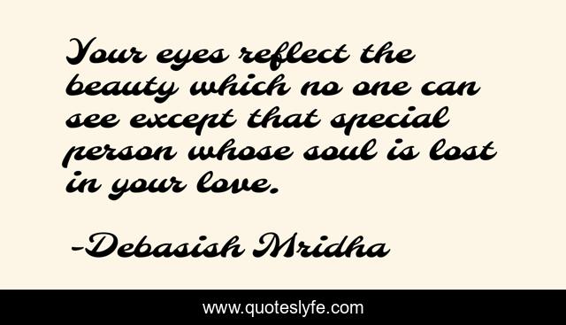 This page presents the quote "Your eyes reflect the beauty which no one can see except that special person whose soul is lost in your love.". Author of this quote is Debasish Mridha. This quote is about miraboli, oscar-wilde, philosophy, debasish-mridha, quotes, your-eyes-reflect-the-beauty, debasish-mridha-md, inspirational, enthusiasm,.