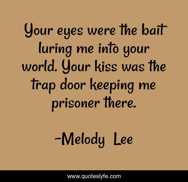 This page presents the quote "Your eyes were the bait luring me into your world. Your kiss was the trap door keeping me prisoner there.". Author of this quote is Melody Lee. This quote is about relationships, eyes, passion, prison,.