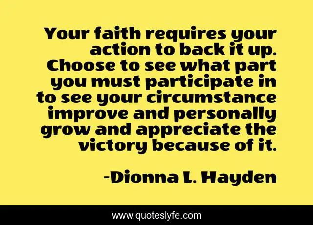 This page presents the quote "Your faith requires your action to back it up. Choose to see what part you must participate in to see your circumstance improve and personally grow and appreciate the victory because of it.". Author of this quote is Dionna L. Hayden. This quote is about faith, life, growth, inspirational, enthusiasm,.