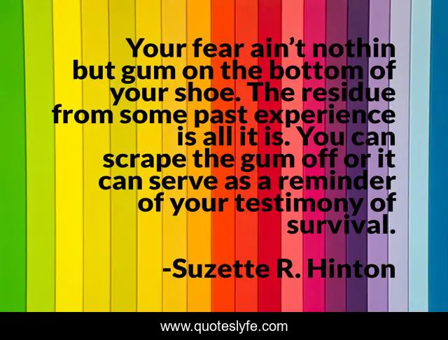 This page presents the quote "Your fear ain’t nothin but gum on the bottom of your shoe. The residue from some past experience is all it is. You can scrape the gum off or it can serve as a reminder of your testimony of survival.". Author of this quote is Suzette R. Hinton. This quote is about fear, survival, testimony,.