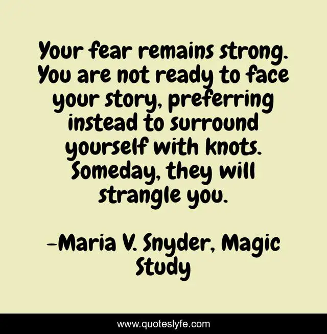This page presents the quote "Your fear remains strong. You are not ready to face your story, preferring instead to surround yourself with knots. Someday, they will strangle you.". Author of this quote is Maria V. Snyder, Magic Study. .