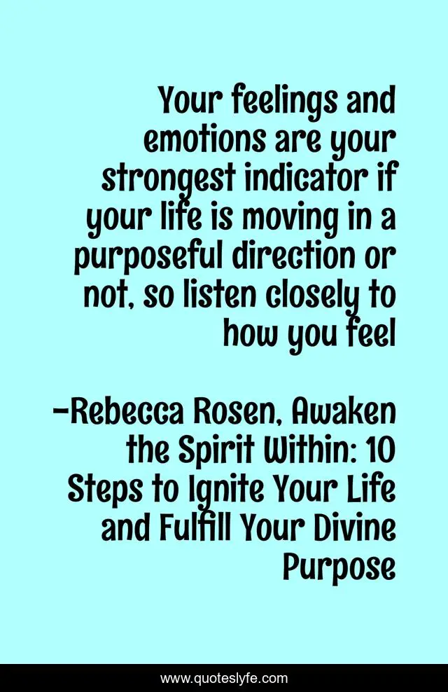 This page presents the quote "Your feelings and emotions are your strongest indicator if your life is moving in a purposeful direction or not, so listen closely to how you feel". Author of this quote is Rebecca Rosen, Awaken the Spirit Within: 10 Steps to Ignite Your Life and Fulfill Your Divine Purpose. This quote is about purpose-of-life, feelings,.