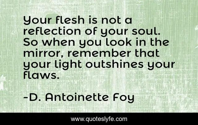 This page presents the quote "Your flesh is not a reflection of your soul. So when you look in the mirror, remember that your light outshines your flaws.". Author of this quote is D. Antoinette Foy. This quote is about beautiful, love, sad, human, mirror, depression, poem, self-love, flaws,.