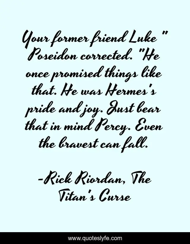This page presents the quote "Your former friend Luke " Poseidon corrected. "He once promised things like that. He was Hermes's pride and joy. Just bear that in mind Percy. Even the bravest can fall.". Author of this quote is Rick Riordan, The Titan's Curse. This quote is about poseidon, percy-jackson,.