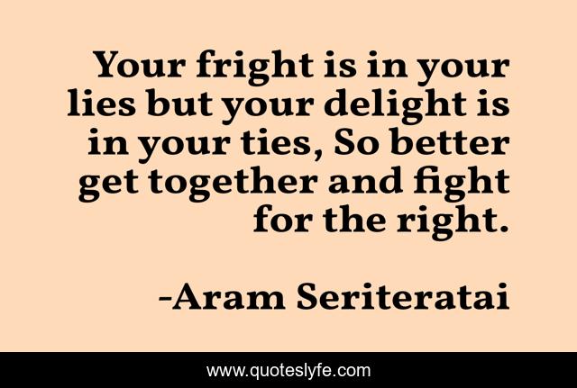 This page presents the quote "Your fright is in your lies but your delight is in your ties, So better get together and fight for the right.". Author of this quote is Aram Seriteratai. This quote is about delight, right,.