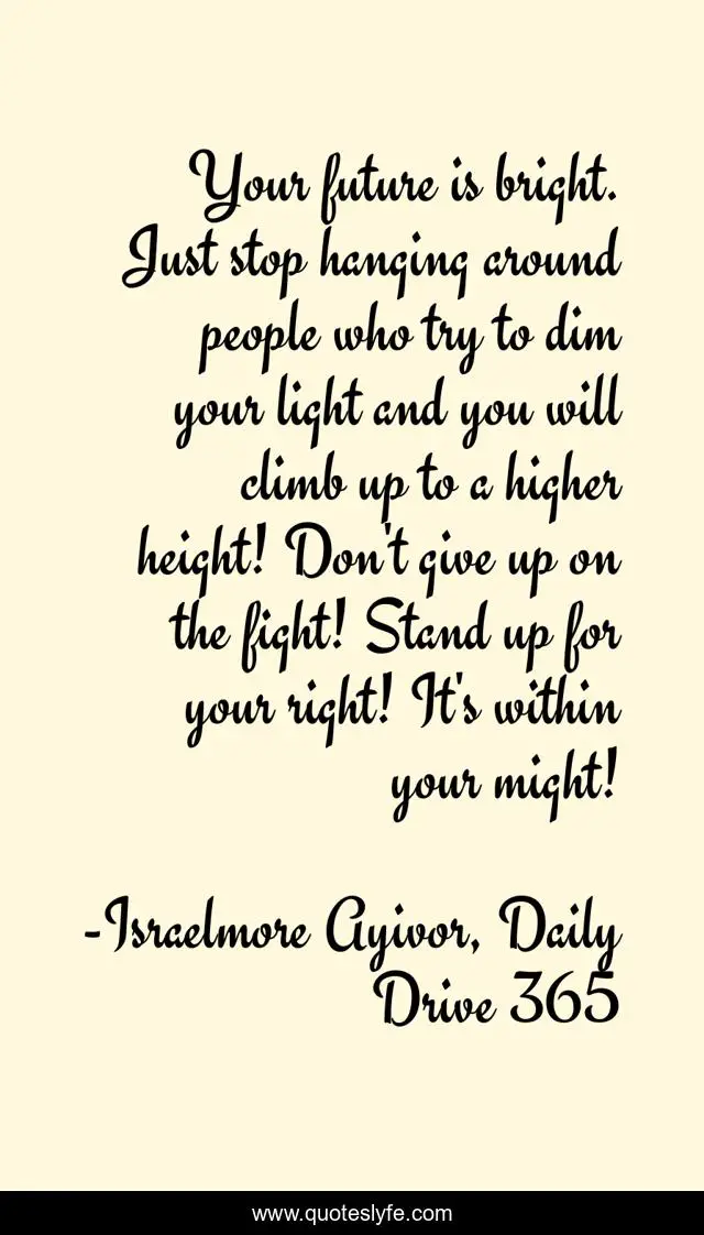 This page presents the quote "Your future is bright. Just stop hanging around people who try to dim your light and you will climb up to a higher height! Don't give up on the fight! Stand up for your right! It's within your might!". Author of this quote is Israelmore Ayivor, Daily Drive 365. This quote is about higher-grounds, people, stand-strong, height, high, bright, higher-heights, food-for-thought, fight,.
