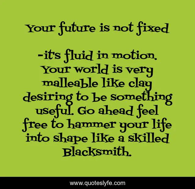 "it's fluid in motion. Your world is very malleable like clay desiring to be something useful. Go ahead feel free to hammer your life into shape like a skilled Blacksmith. Quotes." Quoteslyfe.com, 2025. Fri. 05 Dec. 2025. <https://www.quoteslyfe.com/quote/Your-future-is-not-fixed-106051>.