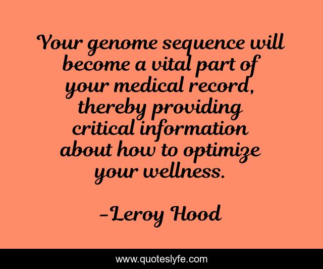 This page presents the quote "Your genome sequence will become a vital part of your medical record, thereby providing critical information about how to optimize your wellness.". Author of this quote is Leroy Hood. This quote is about information, wellness,.