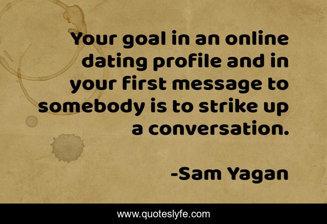 This page presents the quote "Your goal in an online dating profile and in your first message to somebody is to strike up a conversation.". Author of this quote is Sam Yagan. This quote is about conversation, message, goal,.