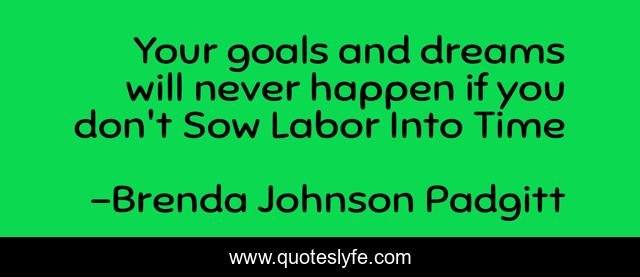 This page presents the quote "Your goals and dreams will never happen if you don't Sow Labor Into Time". Author of this quote is Brenda Johnson Padgitt. This quote is about time-management, labor, goals, sow, time, dreams,.