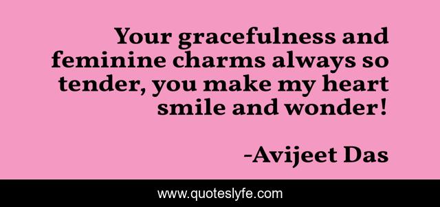 This page presents the quote "Your gracefulness and feminine charms always so tender, you make my heart smile and wonder!". Author of this quote is Avijeet Das. This quote is about feminine-energy, love, heart, valentines, tender-heart, muse, gracefulness, writers, tender,.