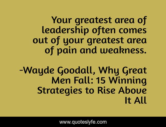 This page presents the quote "Your greatest area of leadership often comes out of your greatest area of pain and weakness.". Author of this quote is Wayde Goodall, Why Great Men Fall: 15 Winning Strategies to Rise Above It All. This quote is about weakness, leadership,.