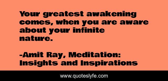 This page presents the quote "Your greatest awakening comes, when you are aware about your infinite nature.". Author of this quote is Amit Ray, Meditation: Insights and Inspirations. This quote is about global-oneness, advaita-vedanta, infinity, source, freedom, realizations, enlightenment, awakening, eternal-love,.
