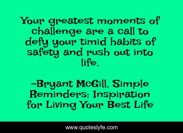 This page presents the quote "Your greatest moments of challenge are a call to defy your timid habits of safety and rush out into life.". Author of this quote is Bryant McGill, Simple Reminders: Inspiration for Living Your Best Life. This quote is about challenges, moments, growth, habits, safety,.