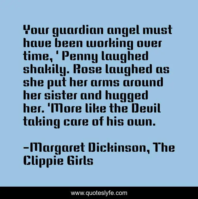 This page presents the quote "Your guardian angel must have been working over time, ' Penny laughed shakily. Rose laughed as she put her arms around her sister and hugged her. 'More like the Devil taking care of his own.". Author of this quote is Margaret Dickinson, The Clippie Girls. This quote is about devil, safety, angel, ww2,.